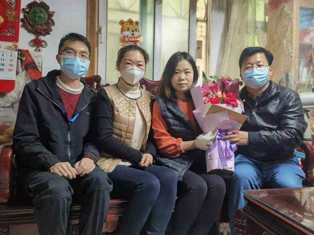 2月23日,罗湖区卫生健康局二级调研员刘岭带队上门看望了何雨遐,送上鲜花和慰问金,东门社康中心副主任张潇潇陪同前往慰问。