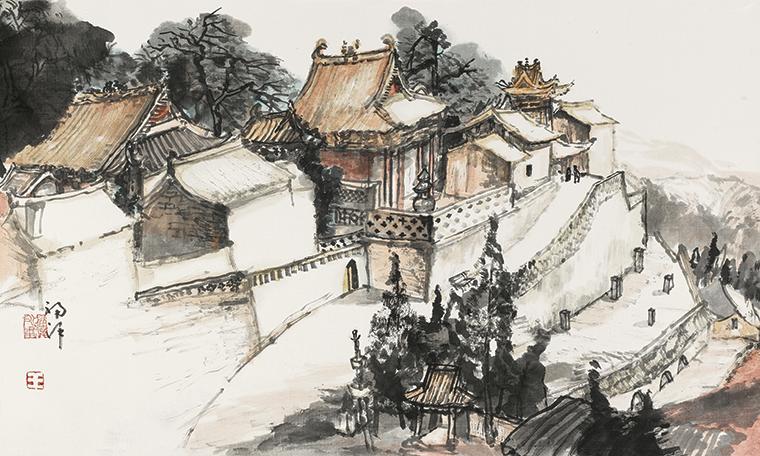 或许是感受到都市化进程的不可逆转,以及都市化对历史、文化、自然无情的切割、抛弃、改变与摧毁,王福泽老师用笔墨虔诚地对着那些曾经繁华与喧嚣过的,镌刻着时光痕迹的建筑与风景,平和地将它们描画下来,让它们像“长者”一样活在他的“述说”里。