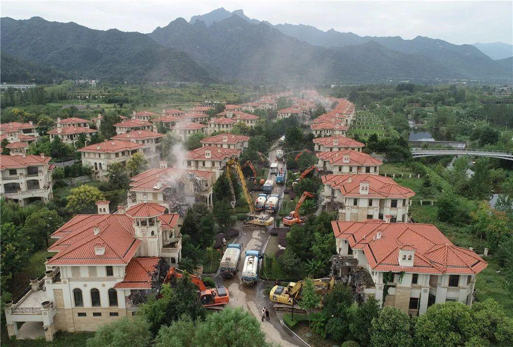大型机械在陕西省西安市长安区秦岭违建别墅群“群贤别业”内进行拆除工作(2018年9月6日摄,无人机照片)。新华社记者 邵瑞 摄