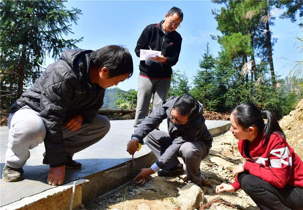 在广西柳州市融水苗族自治县良寨乡培洞村,纪检监察干部(右一、二、三)在检查扶贫道路施工情况(2019年11月5日摄)。新华社记者 黄孝邦 摄