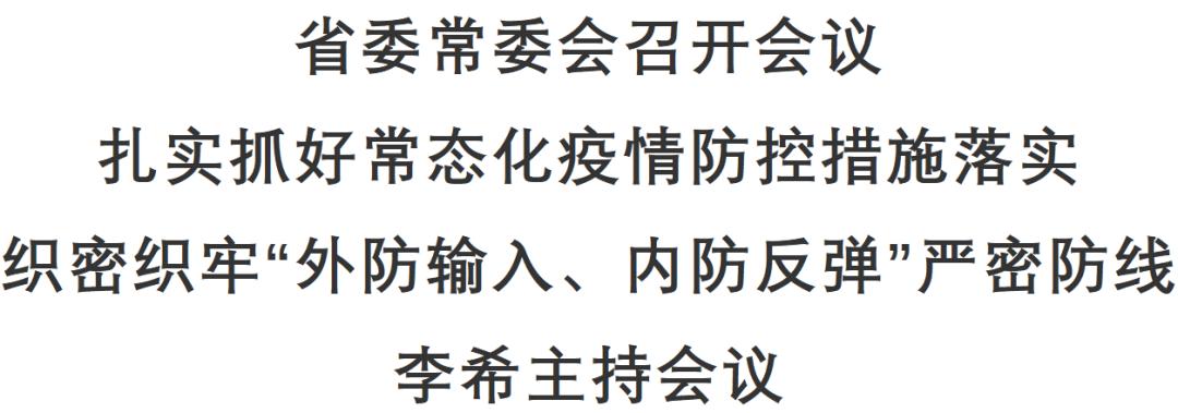 2月23日,省委常委会召开会议,同时套开省新冠肺炎防控领导小组(指挥部)会议,认真学习贯彻习近平总书记关于疫情防控工作的重要指示精神,听取我省疫情防控情况汇报,研究部署下一步工作。省委书记李希主持会议。