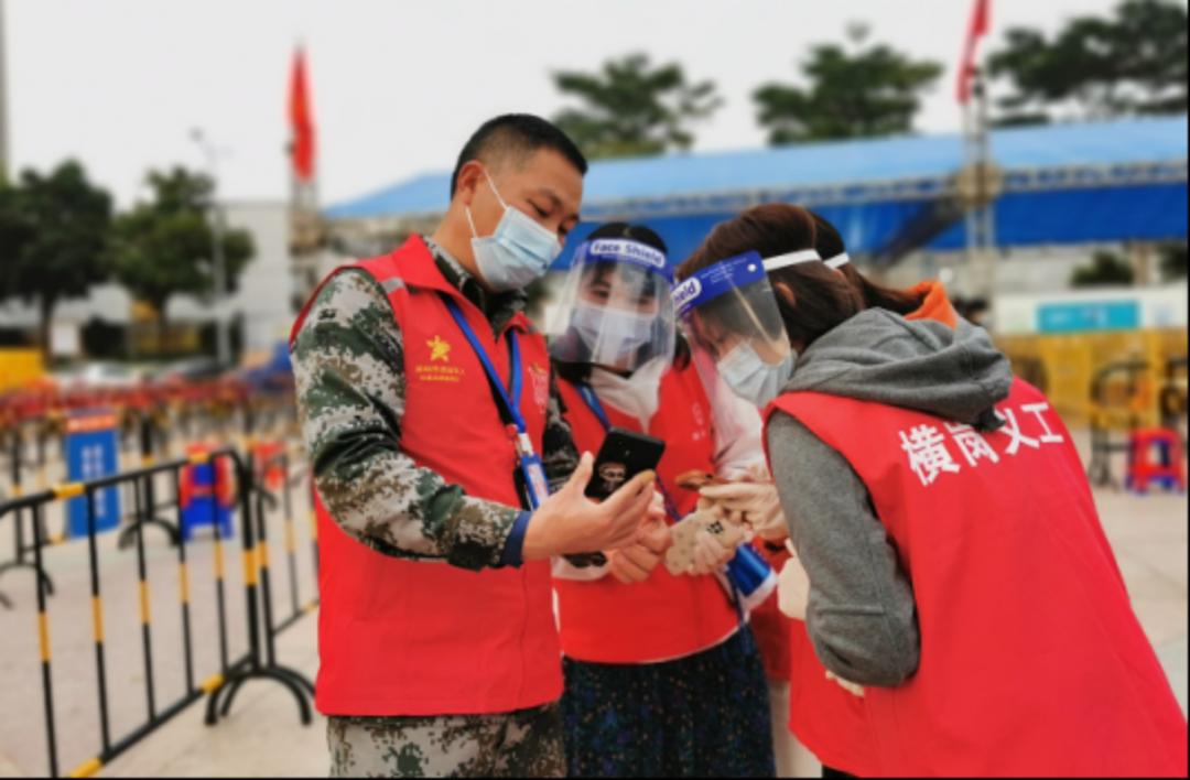疫情来临,没有人是旁观者,退役“老兵”也来了。听说横岗文体广场检测点缺人,退役军人、红星志愿队青年队长王小兵立即在群里招募,半小时就有13名退役老兵报名,6点全体到位,这一干就直接干到了凌晨4点。