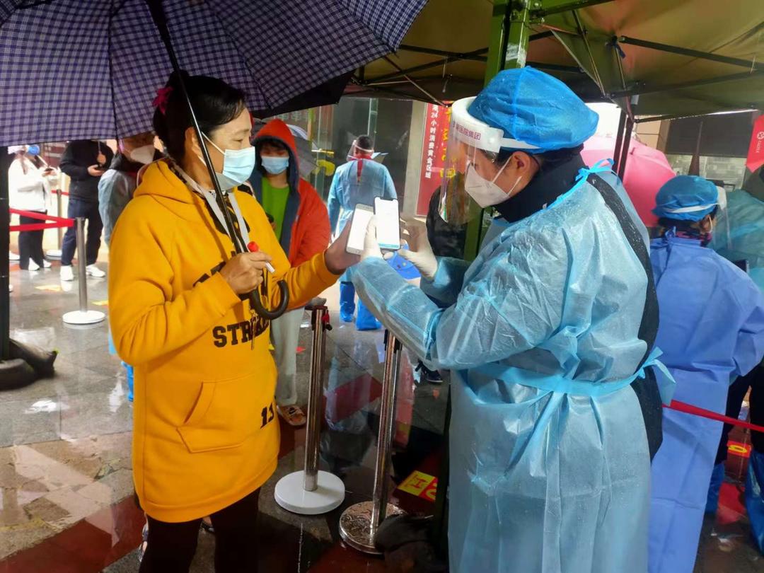 “请大家提前扫码填好信息,注意保持安全距离。”在海旺社康核酸检测点,虽然寒风凛冽,但志愿者陈文香和其他伙伴冒雨早早来到核酸检测点进行采样的准备工作,看到有行动不便的老人和其他特殊人群就主动上前询问,并帮助其走“绿色通道”。