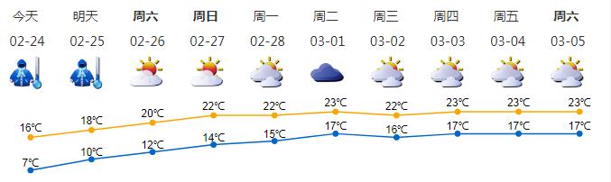 ●2月24日多云间晴天,早晚寒冷;气温7-16℃;北风3级,沿海、高地和海区阵风6级;相对湿度60%-95%。