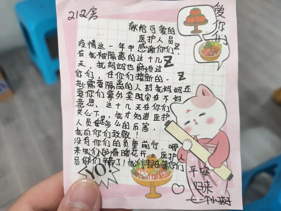 隔离期结束后,该妇女写了一封真挚的感谢信,“感谢你们夜以继日的付出,不厌其烦地解决我的困境,你们的关心和照顾让我铭记于心……”