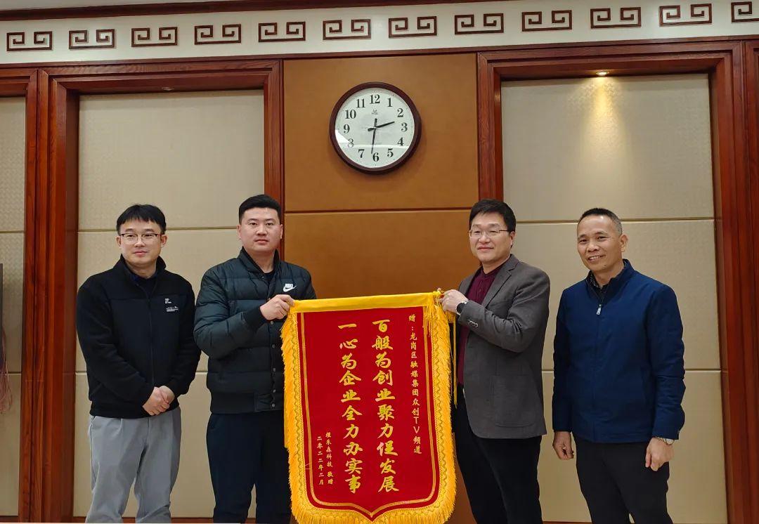 深圳煜禾森科技有限公司总经理李雷达(左二)向龙岗区融媒集团党委书记、董事长罗方史(右二)赠送锦旗