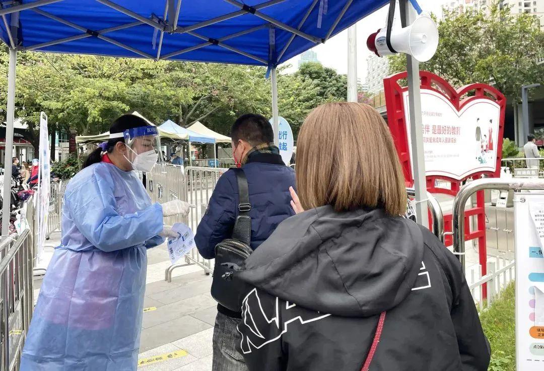 在罗湖翠竹街道新村社区采样点上,9名港籍义工志愿者身穿“橙马甲”在雨中穿行。他们是由香港深圳翠竹同乡会、翠竹港人联谊会自发组织的港籍义工队伍。