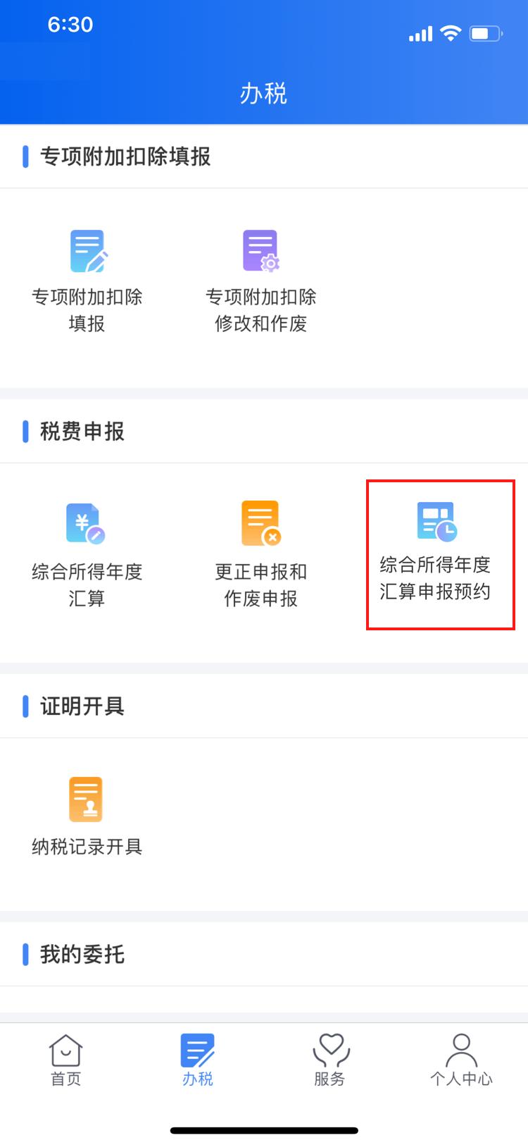 打开个人所得税APP,通过【首页】-【2021综合所得年度汇算专题区域】点击【去预约】进入预约功能页面,也可通过【我要办税/办税】-【综合所得年度汇算申报预约】进入,如下所示: