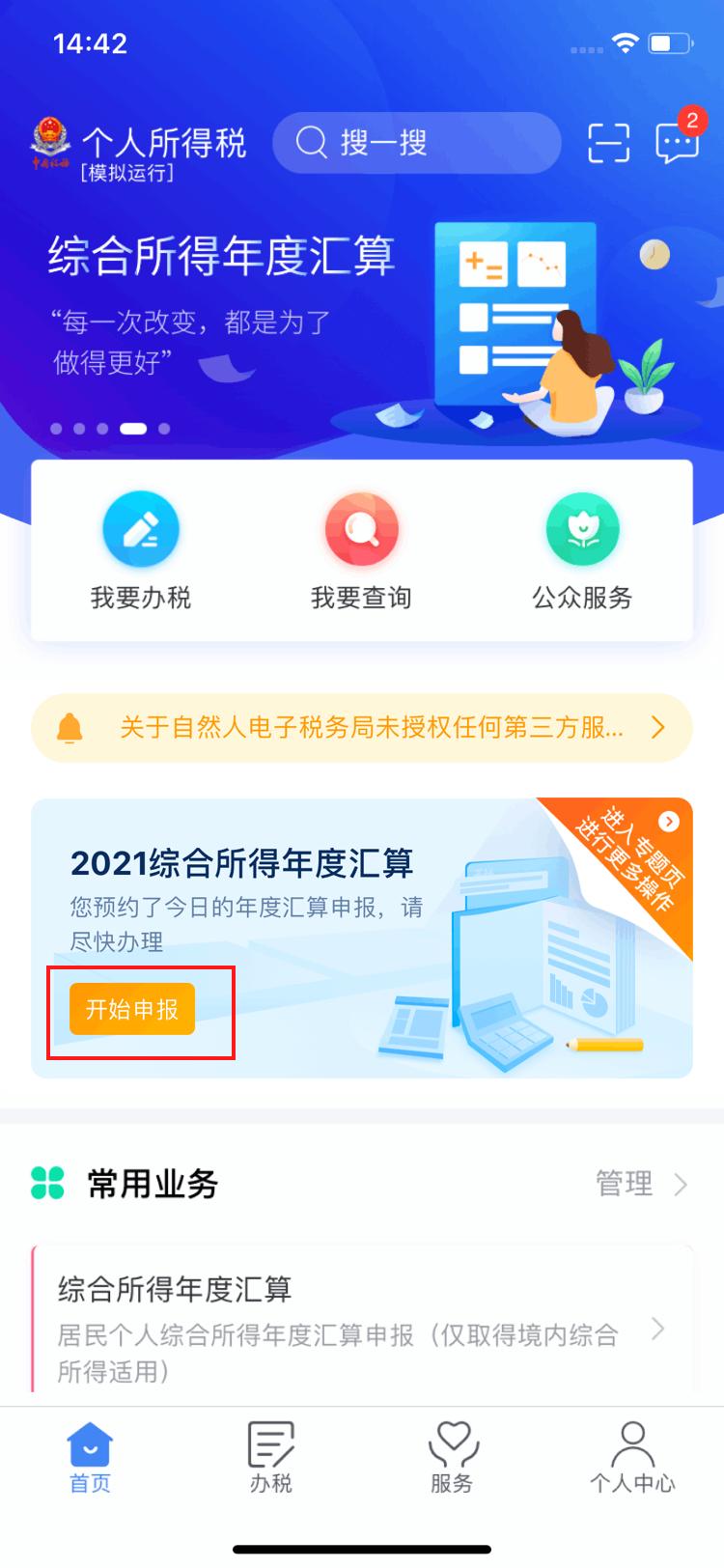打开个人所得税APP,您可通过【首页】-【2021综合所得年度汇算专题区域】点击【开始申报】,或通过【我要办税/办税】-【综合所得年度汇算】发起申报,如下图所示: