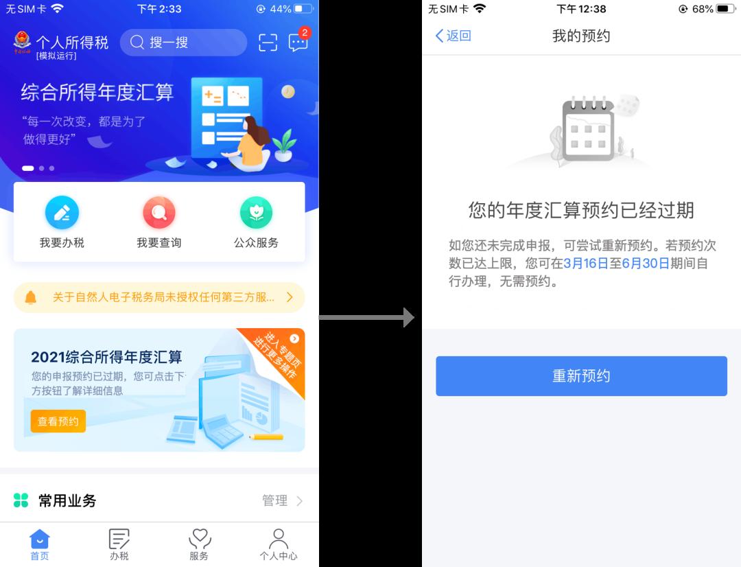 需要在3月1日至3月15日办理2021综合所得年度汇算的纳税人,可在2月16日至3月15日的每日6点至22点预约办理时间(3月16日至6月30日期间,无需预约即可办理)。具体步骤如下: