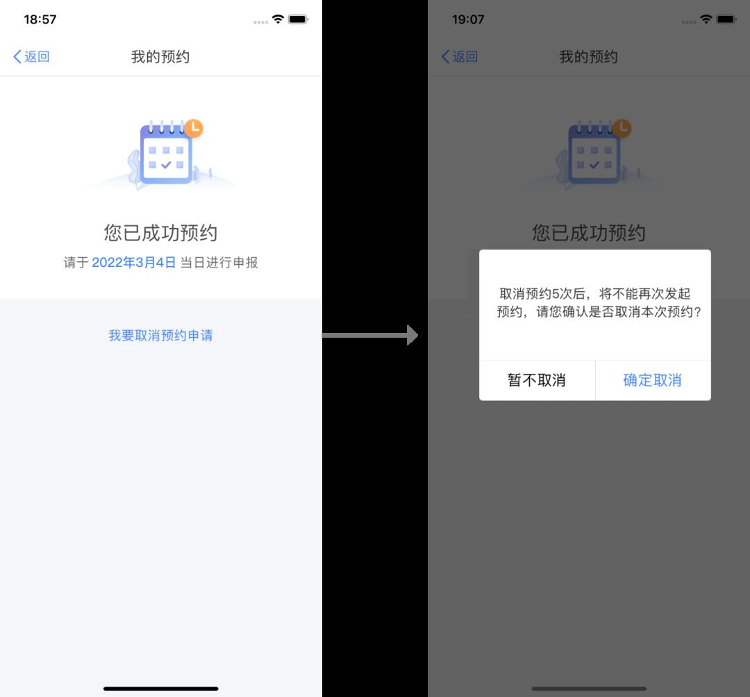 在所选的日期之前,您也可以通过该页面上的【我要取消预约申请】按钮取消您的预约。取消成功后,可重新发起预约。