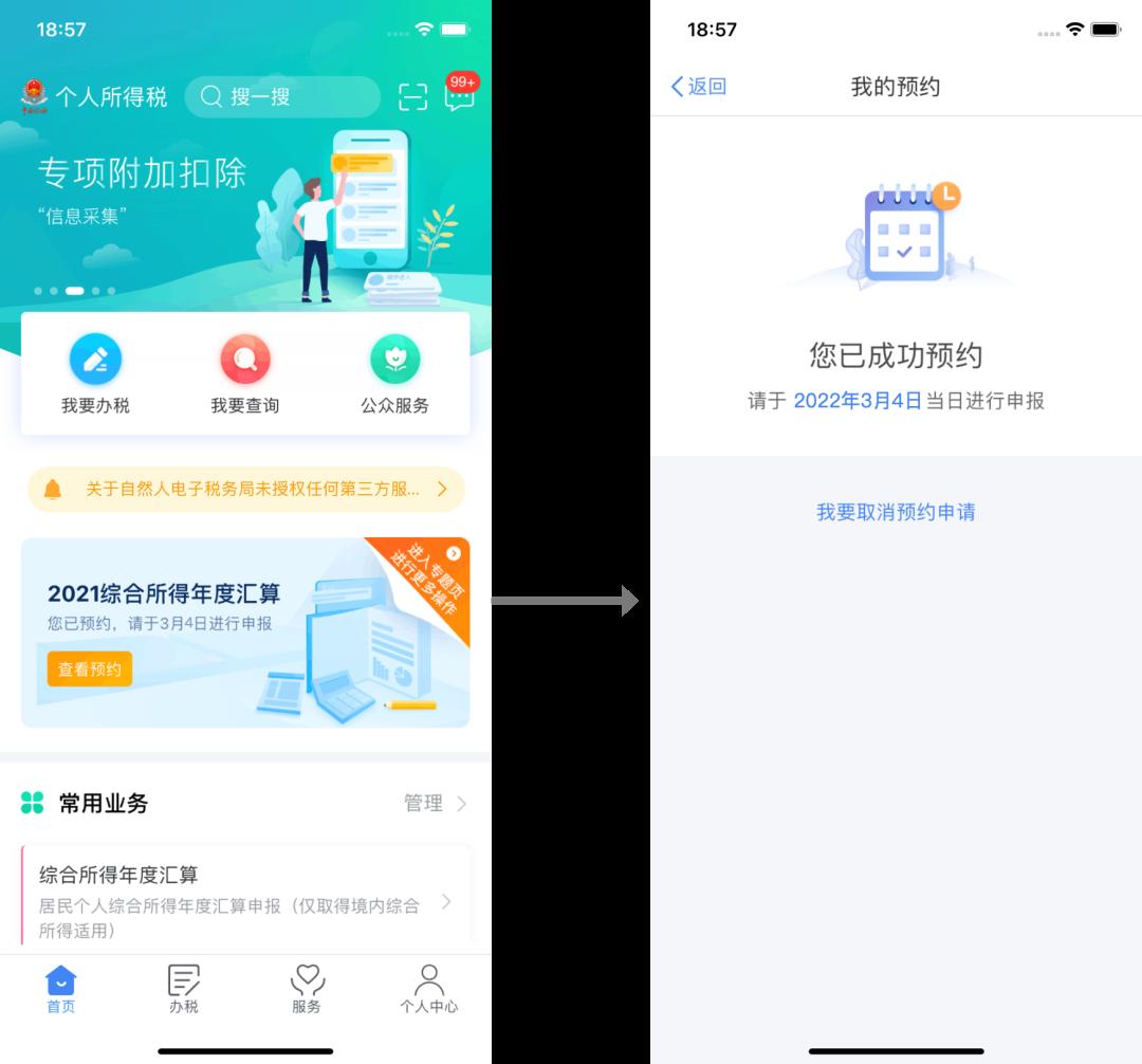 ● 三步走!教您在个税APP上预约办理2021个税年度汇算● 一图读懂个人所得税综合所得年度汇算变化点● 2021年度个税汇算预约办理问答