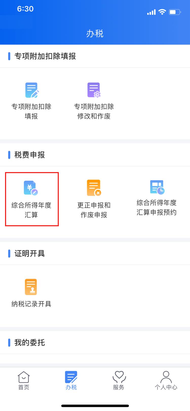 打开个人所得税APP,您可通过【首页】-【2021综合所得年度汇算专题区域】点击【开始申报】,或通过【我要办税/办税】-【综合所得年度汇算】发起申报,如下图所示: