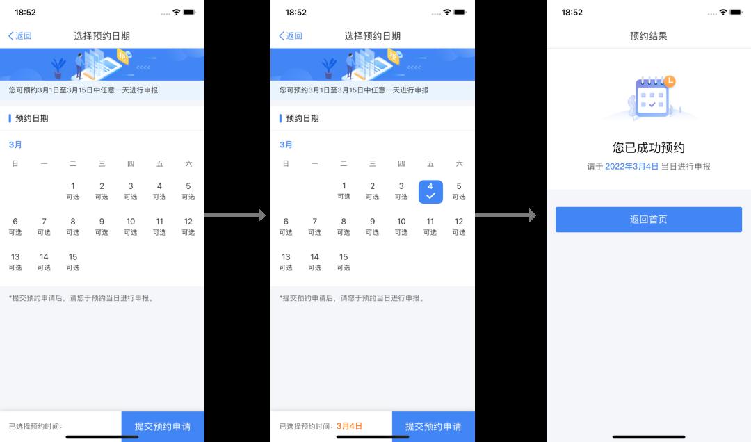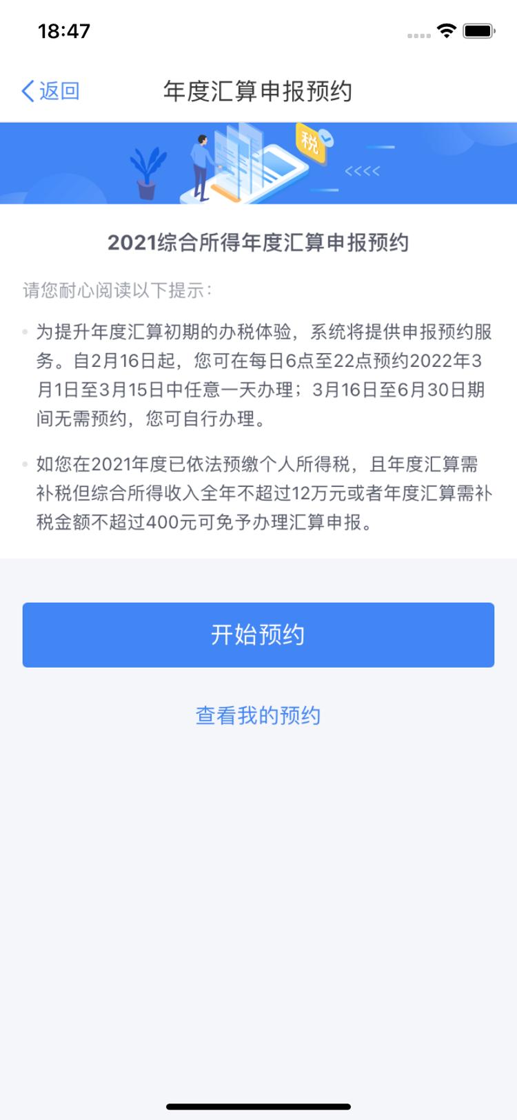 需要在3月1日至3月15日办理2021综合所得年度汇算的纳税人,可在2月16日至3月15日的每日6点至22点预约办理时间(3月16日至6月30日期间,无需预约即可办理)。具体步骤如下: