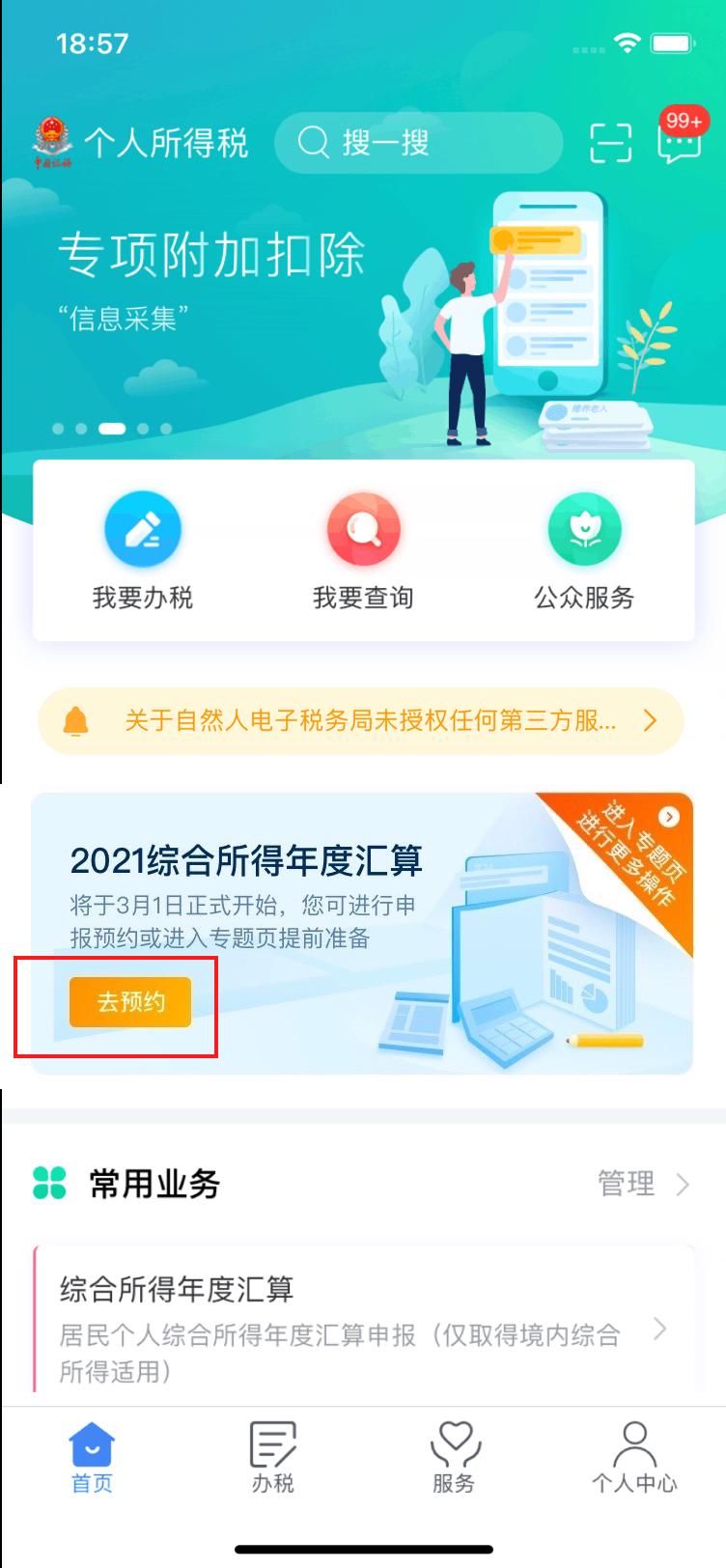 打开个人所得税APP,通过【首页】-【2021综合所得年度汇算专题区域】点击【去预约】进入预约功能页面,也可通过【我要办税/办税】-【综合所得年度汇算申报预约】进入,如下所示: