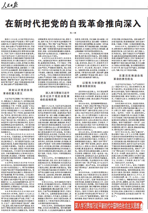 2月24日,人民日报刊发中央政法委秘书长陈一新关于在新时代把党的自我革命推向深入的署名文章,学习贯彻十九届中央纪委六次全会精神,从深刻认识自我革命的重大意义、深入学习贯彻习近平总书记关于自我革命的战略思想、强化自我革命举措、压紧压实责任担当等四个方面进行了系统阐述。以下是文章全文。
