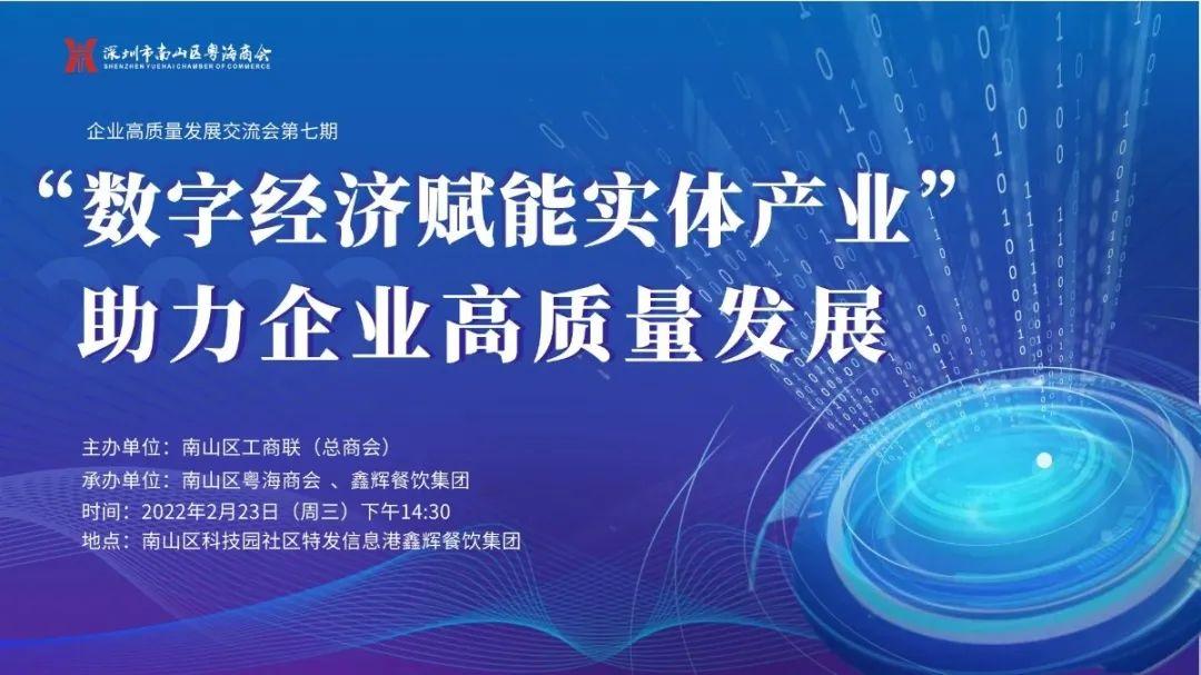 2022年2月23日下午,由南山区工商联(总商会)主办,粤海商会、鑫辉餐饮集团承办的“企业高质量发展交流会第七期——数字经济赋能实体产业”在鑫辉餐饮集团会议室圆满举行。市人大代表、南山区工商联(总商会)副会长、粤海商会副会长、鑫辉餐饮集团董事长王传启,粤海商会监事长、海岸集团执行董事朱力为及20多位企业家代表参加本次活动。