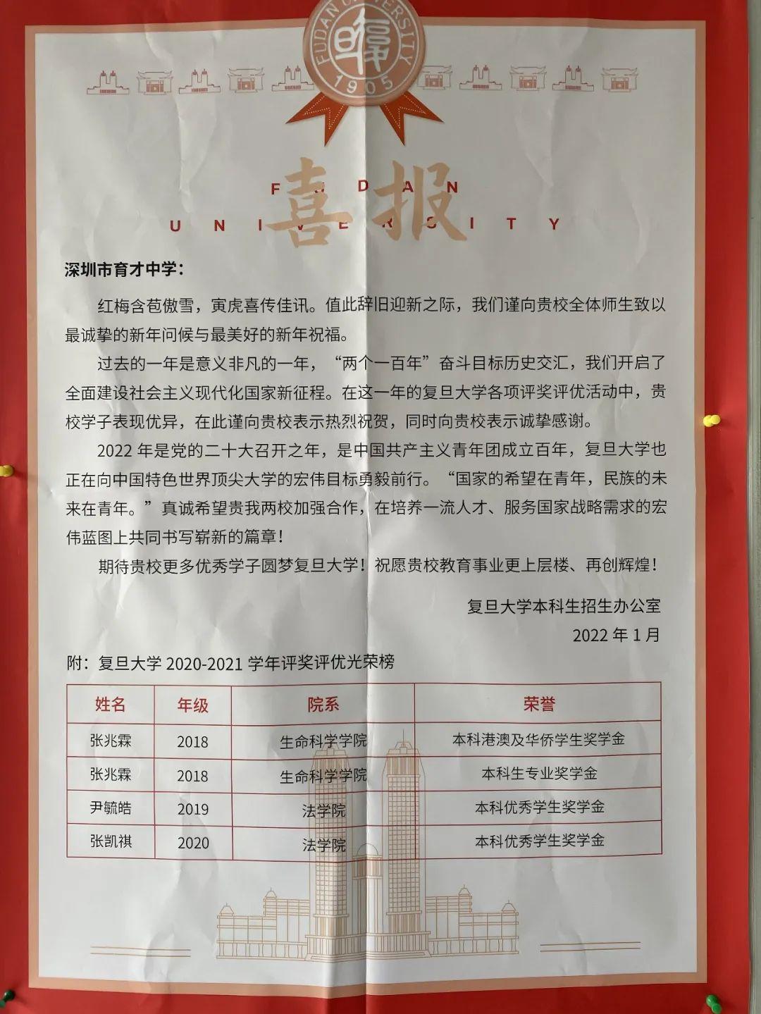 新年伊始,育才中学又双叒叕接到了来自高校的喜报——在南京大学发来喜报后,复旦大学的喜报也翩然而至。
