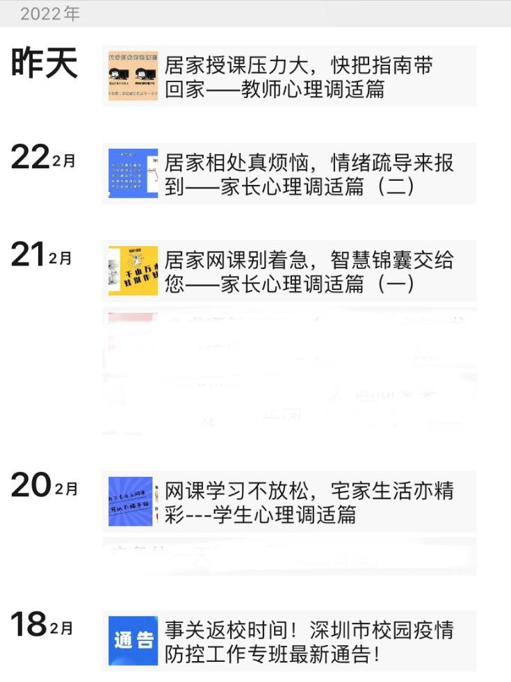 ○连续通过学校微信公众号、家委群、教师、家长微信群,将心理调适等相关内容及时推送给师生及家长。以班级为单位,及时向学生和家长推送心理援助热线,积极开展了心理干预和心理疏导工作。