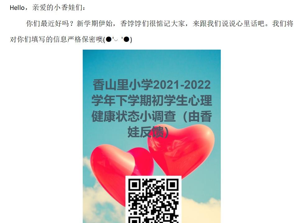 为更好地了解和评估疫情期间学生的心理状态,香山里小学心理梦工厂开展了《2021-2022学年下学期初学生心理健康状态小调查》,该问卷主要由1-6年级的小香娃完成。