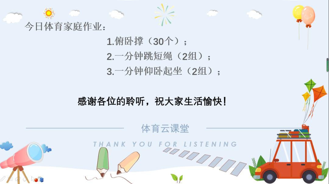 高段(七、八、九年级)学生通过每天的课间操和线上体育课,结合体育中考项目特点并考虑到锻炼场所特点,选用专业体能训练,逐渐为体育中考和体质测试打好基础。