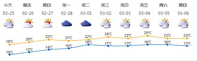 ●2月25日多云间晴天;气温10-18℃;东北风3级;相对湿度60%-90%。