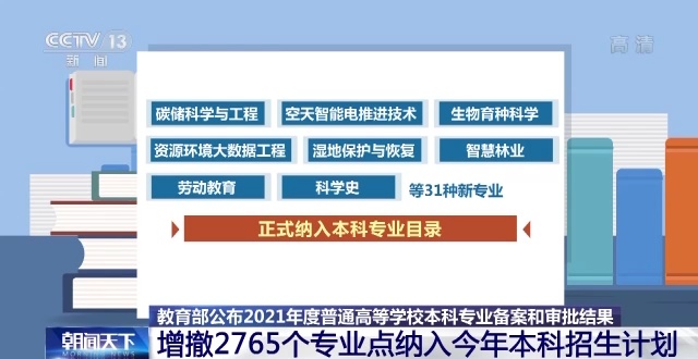 日前,教育部公布了2021年度普通高等学校本科专业备案和审批结果,其中新增专业点1961个、撤销专业点804个,31种新专业列入《普通高等学校本科专业目录》,本次备案、审批和调整的专业点,将列入相关高校2022年本科招生计划。