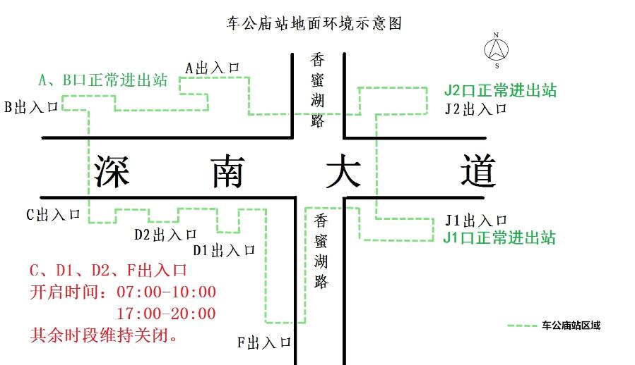 自2月24日起,深圳地铁1号线香蜜湖站暂停运营服务,双方向列车不停站通过。地铁车公庙站C、D1、D2、F出入口开放时间调整为每天早高峰7:00—10:00、晚高峰17:00—20:00,J1出入口恢复正常通行。此外,竹子林站A、B1、C、D、E出入口,侨城东站B、C1、C2出入口仍维持关闭状态。请市民乘客提前做好出行安排。给您出行带来不便,我们深表歉意!