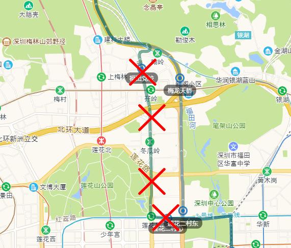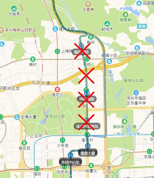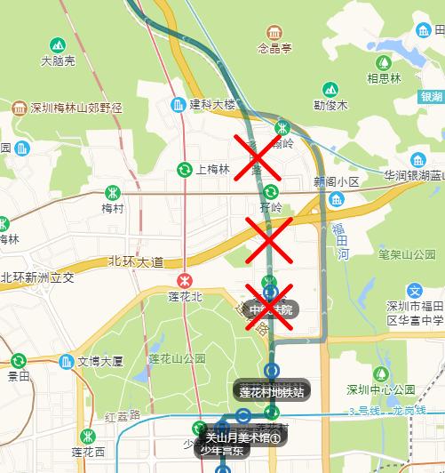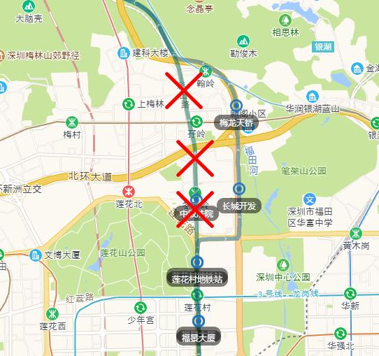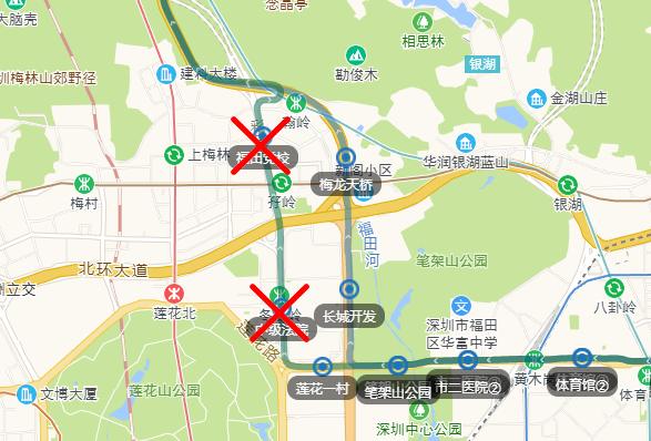 往深圳北站交通枢纽公交场站方向取消“中级法院、莲花村地铁站”等2个单边公交停靠站。