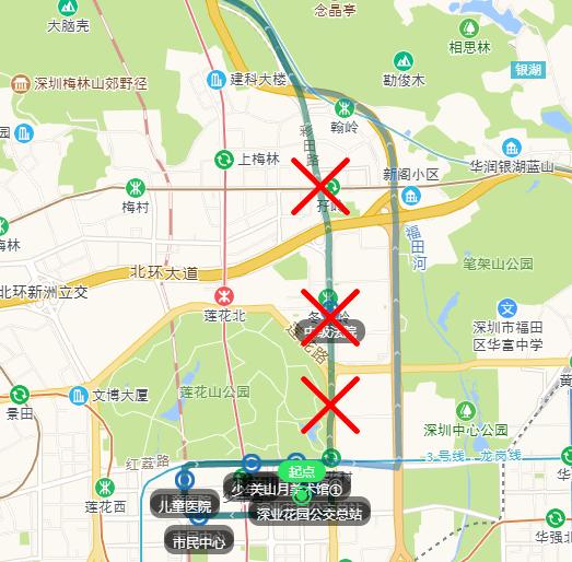 M500线往简上村公交总站方向部分途经道路由彩田路、梅观路调整为彩田路、红荔路、皇岗路、梅观路。