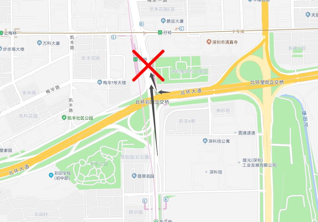 M347线往深圳北站交通枢纽公交场站方向部分途经道路由彩田路调整为彩田路、红荔路、皇岗路、笋岗路、莲花路、宏威路、北环大道、彩田路。
