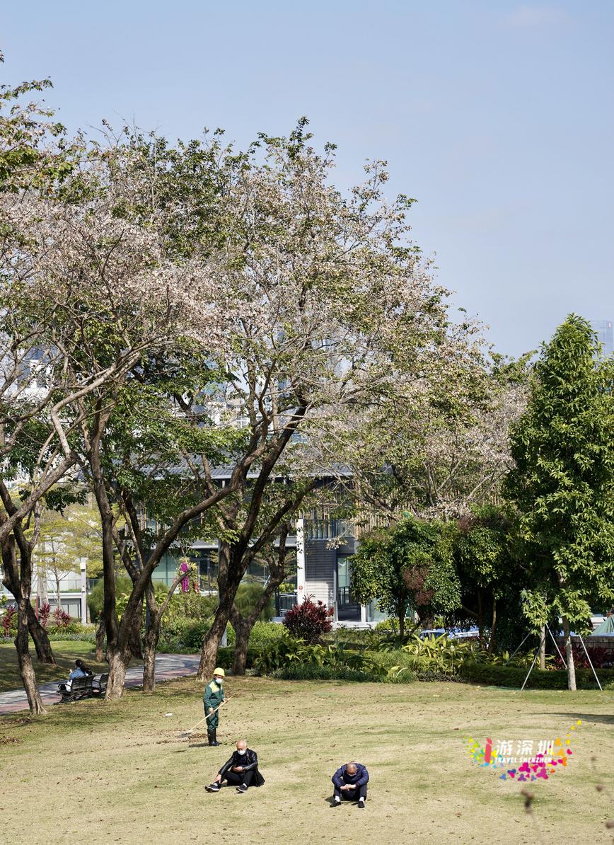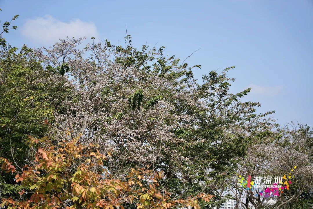 公园的入口有一片印度紫檀。2月,果实成熟,圆形扁平的种子随风落地,树冠“白了头”,远远望去像“樱花树”般烂漫可爱。