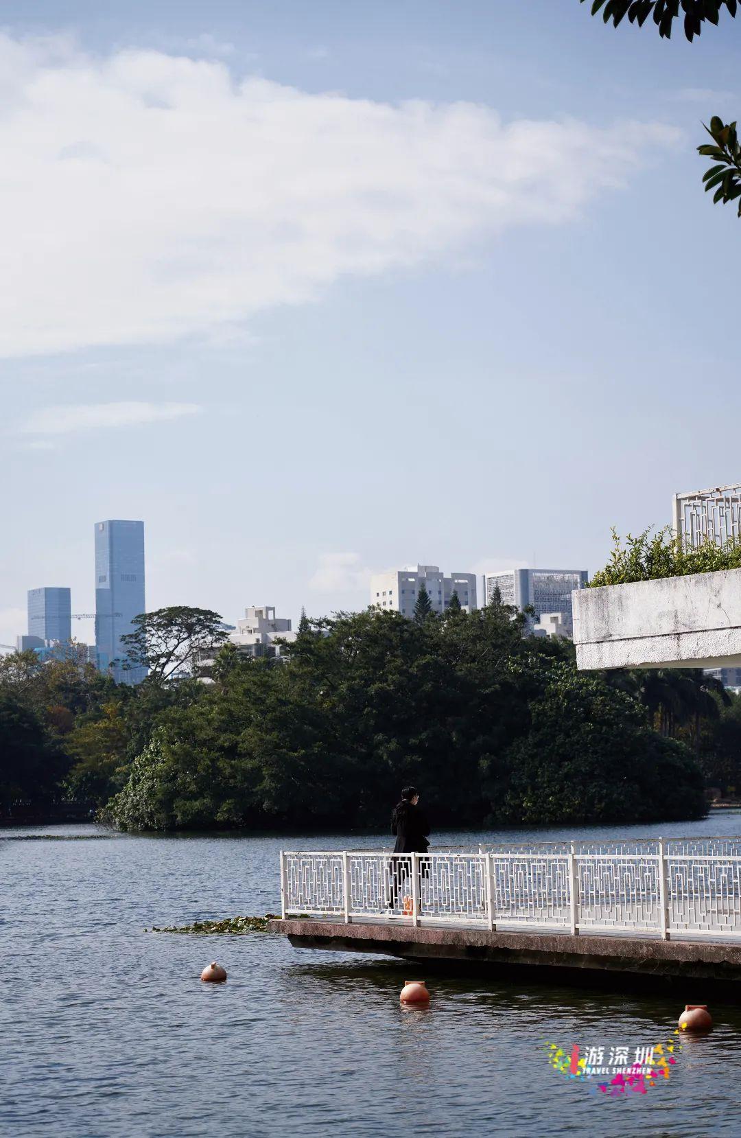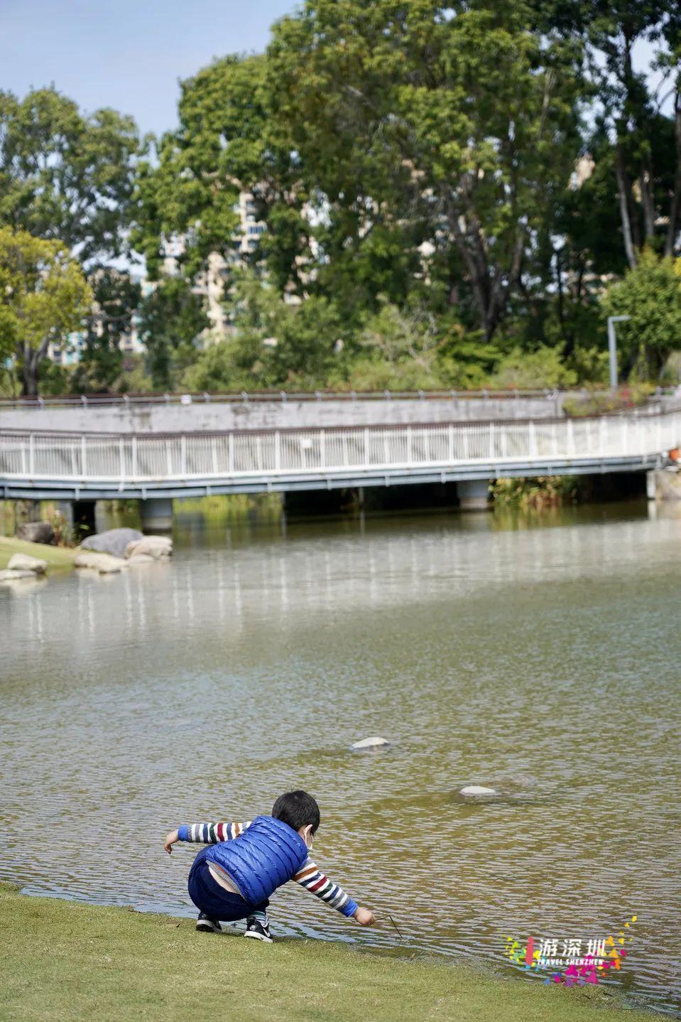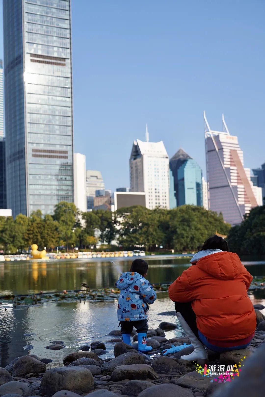 走过揽月桥,就来到一片开阔的石滩,孩子们可以撒开脚丫子玩。对面是深圳地标性建筑京基100和地王大厦。往湖边随意一站,哪个角度都是大片。