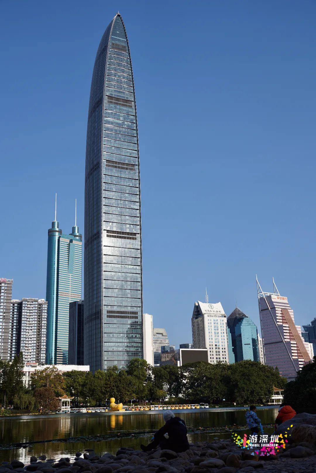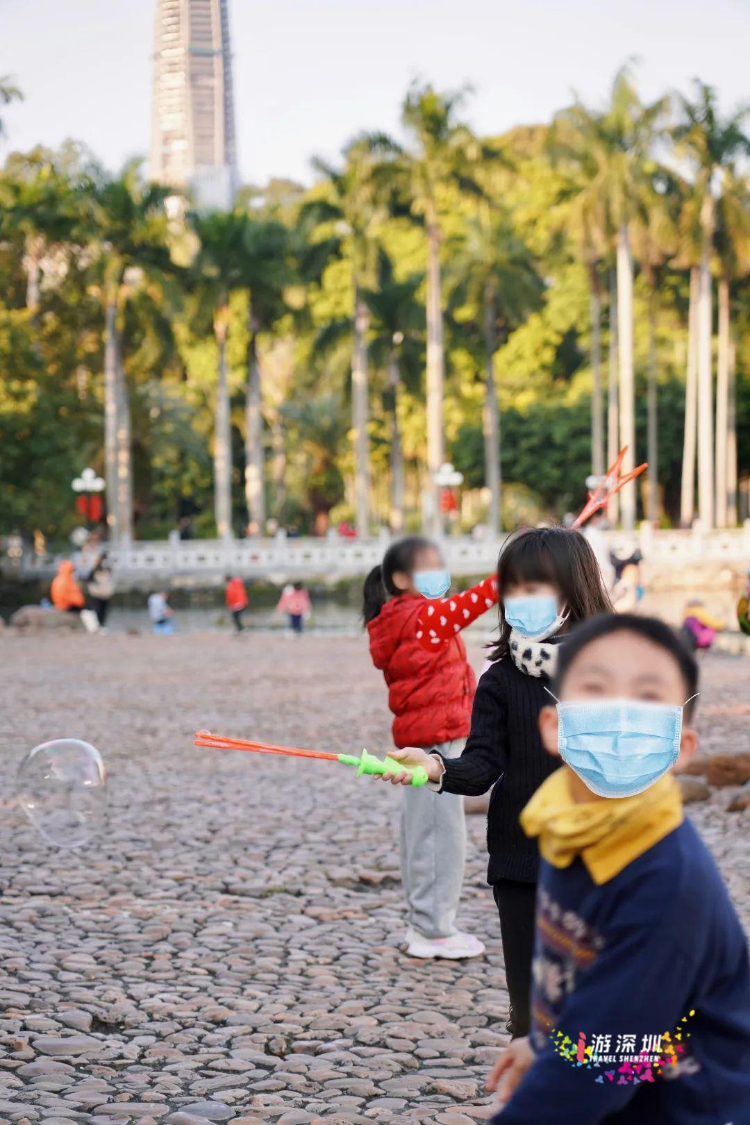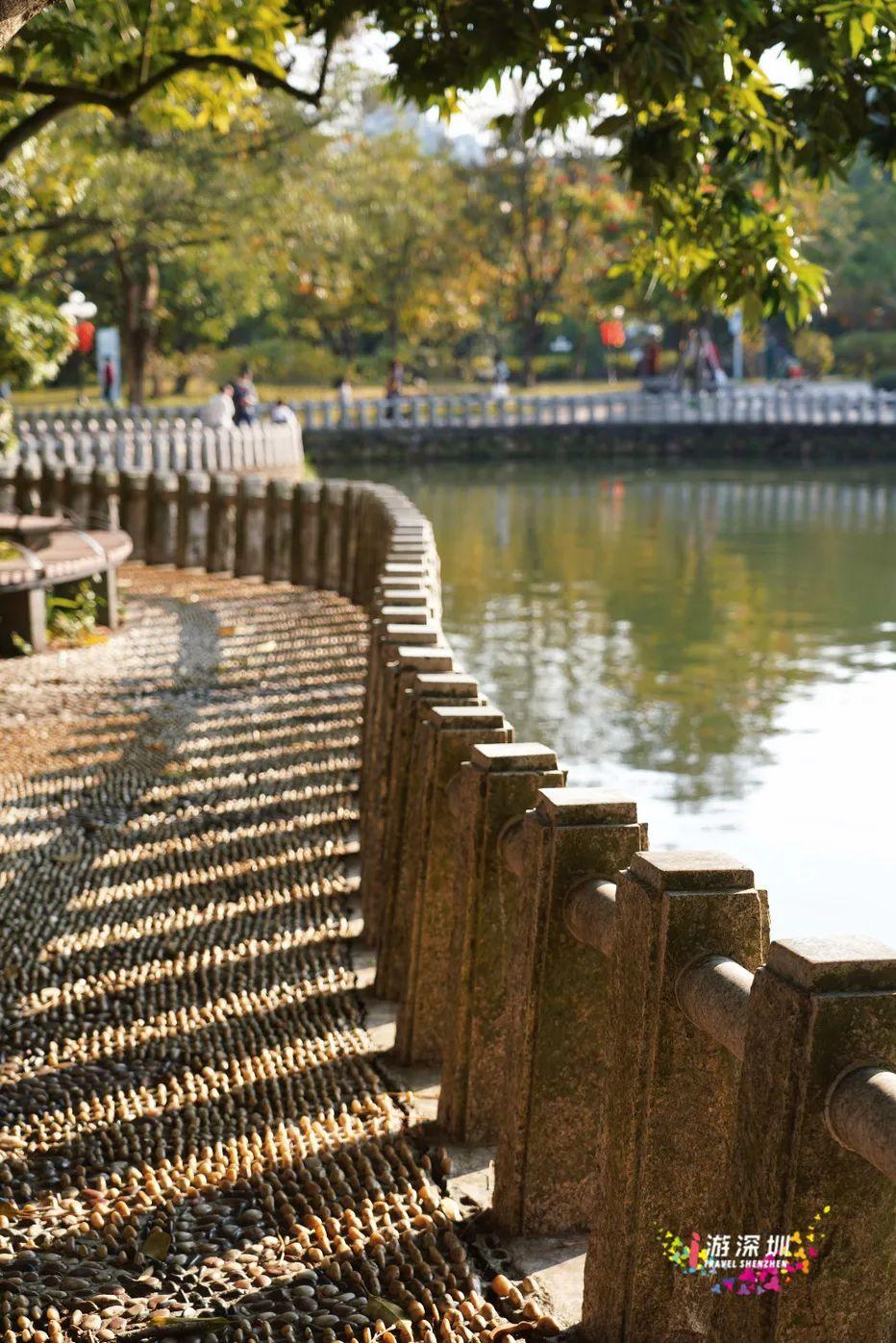 走过揽月桥,就来到一片开阔的石滩,孩子们可以撒开脚丫子玩。对面是深圳地标性建筑京基100和地王大厦。往湖边随意一站,哪个角度都是大片。