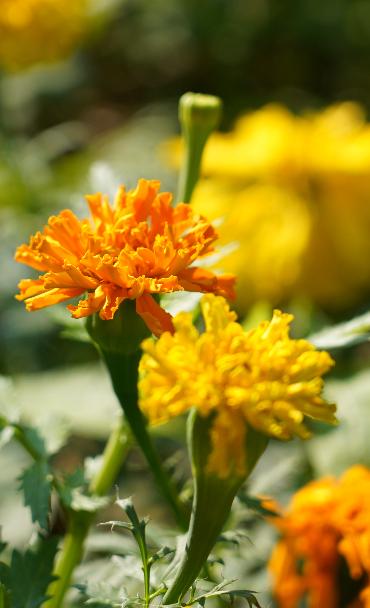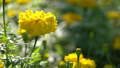 从公园北2门进入,走一小段路即可看到花圃,面积约800㎡,大片的万寿菊中点缀着硫华菊。颜色深浅不一,在阳光下熠熠生辉,深黄浅绿堆叠下,恍若闯入“莫奈花园”。花圃边铺有石板路和供休憩的石凳。