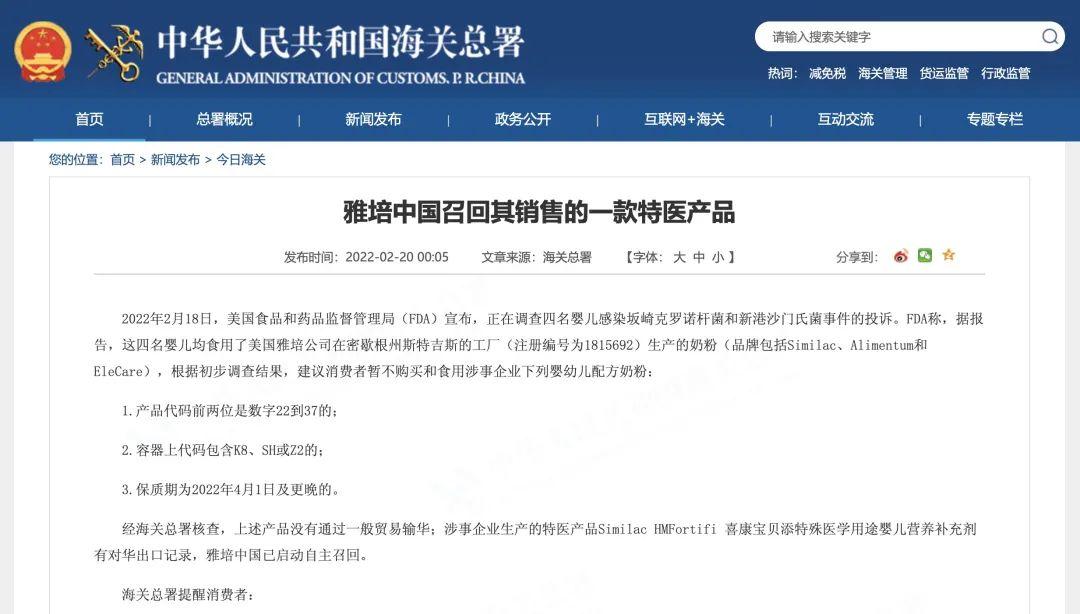 海关总署日前发布公告,提醒消费者“暂不通过任何渠道购买”以及“立即暂停食用”美国雅培公司旗下相关婴幼儿产品。
