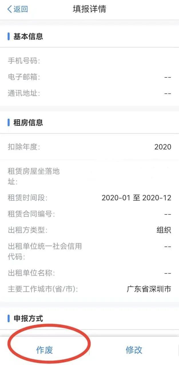 (三)点击已经填报的【住房租金】栏目,将其作废。(如果存在住房贷款,可以录入住房贷款信息)。