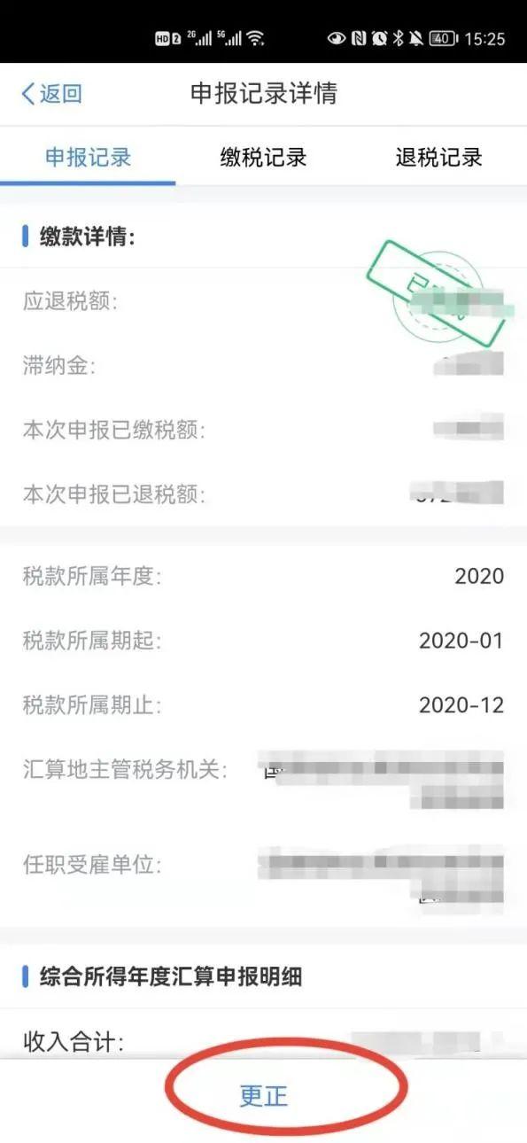 2、在已完成页面点击“2020年度综合所得年度汇算”,点击“更正”,然后提交申报。