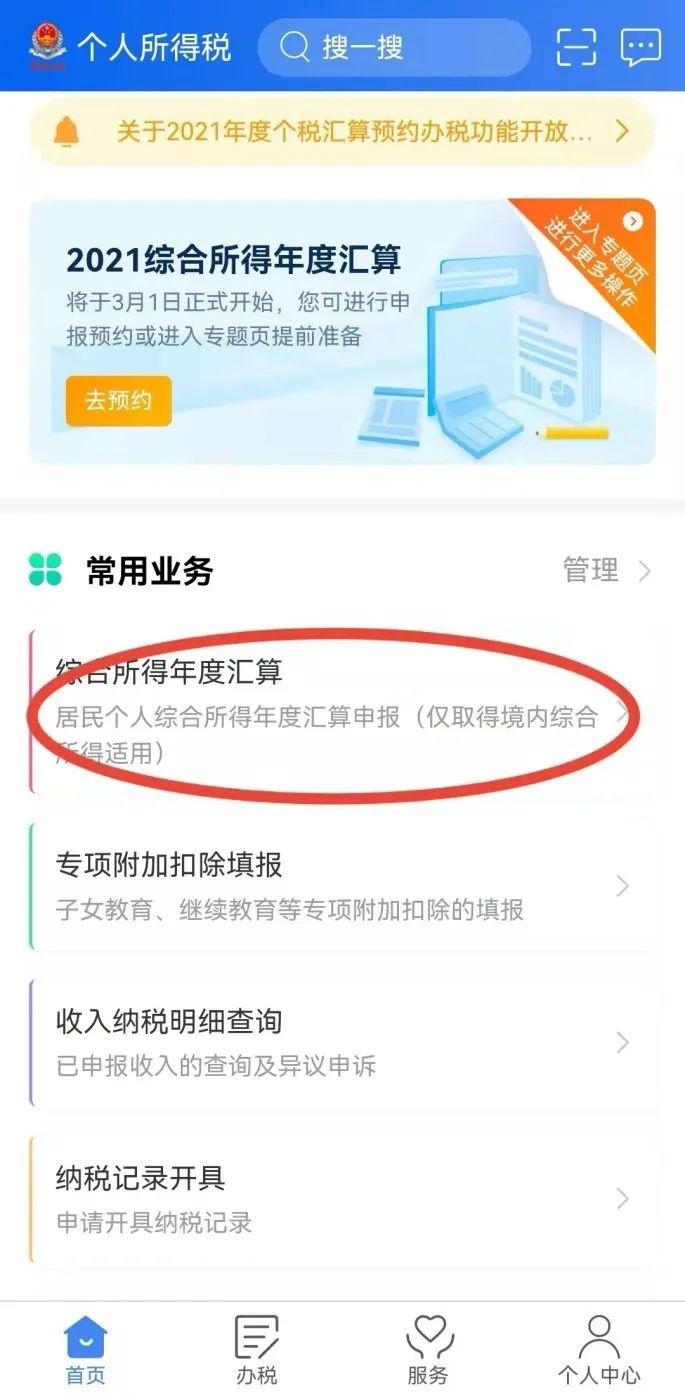 1、返回首页,点击【常用业务-综合所得年度汇算】,我们以2020年度为例。