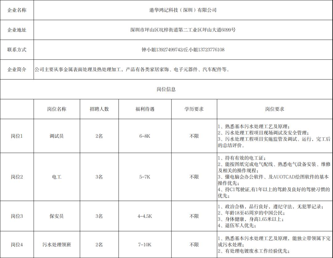 第六十四波招聘速递来啦。小编再次为大家收集了坪山区的最新招聘信息快看有没有合适自己的岗位。招聘详情点击图片01深圳市达兴服装有限公司02深圳市金禾田物业管理有限公司03港华鸿记科技(深圳)有限公司04深圳市建艺纸品有限公司05深圳市展业精密塑胶有限公司06东方诺华科技(深圳)有限公司07深圳正一电子电缆有限公司08深圳市永盛昌包装制品有限公司09深圳市展业精密塑胶有限公司10深圳市精研旺研磨科技有限公司如果大家有应聘意向请致电企业招聘联系人