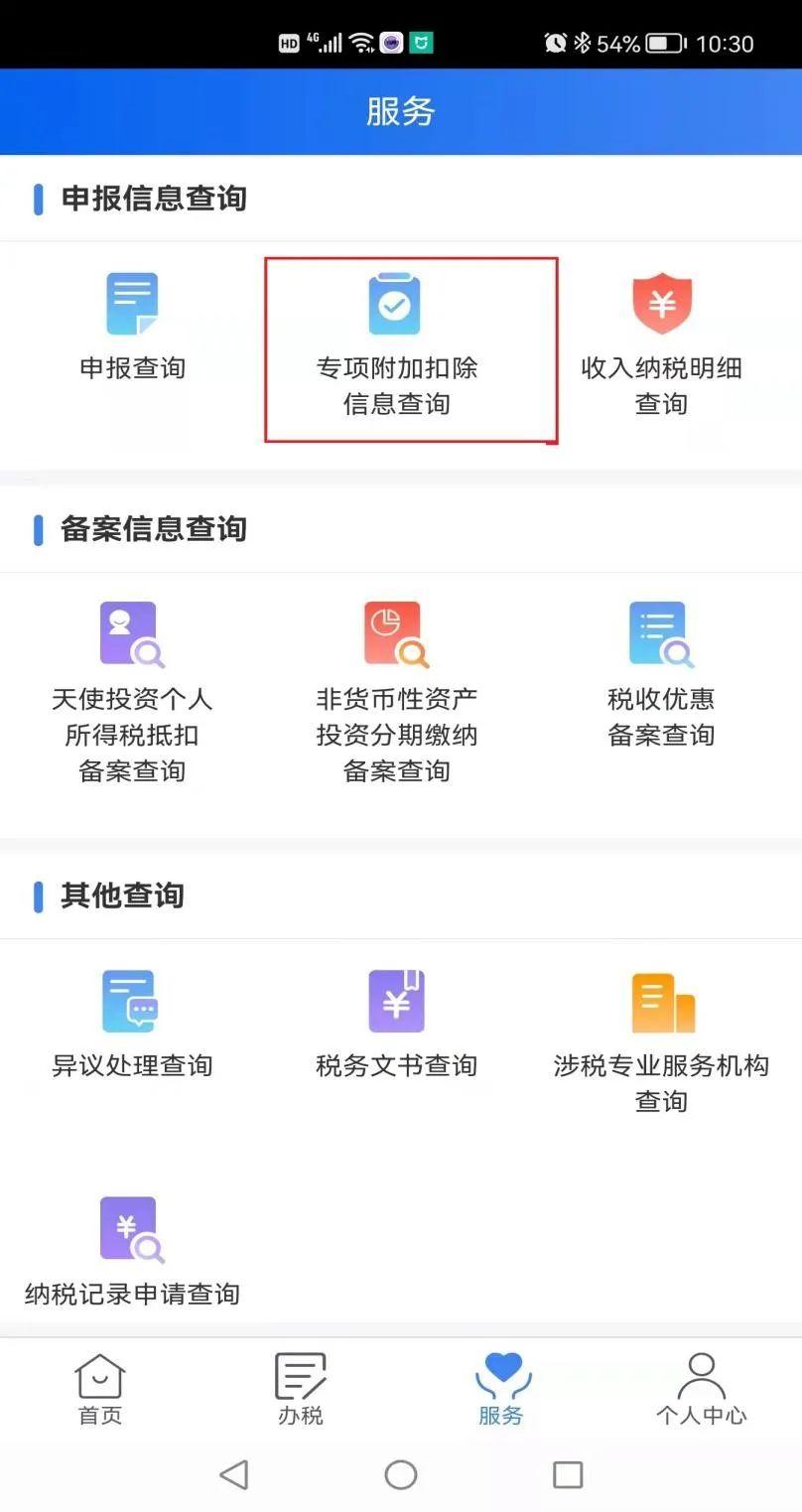 (一)纳税人登陆“个人所得税”手机APP,进入“服务”-“专项附加扣除信息查询”模块。