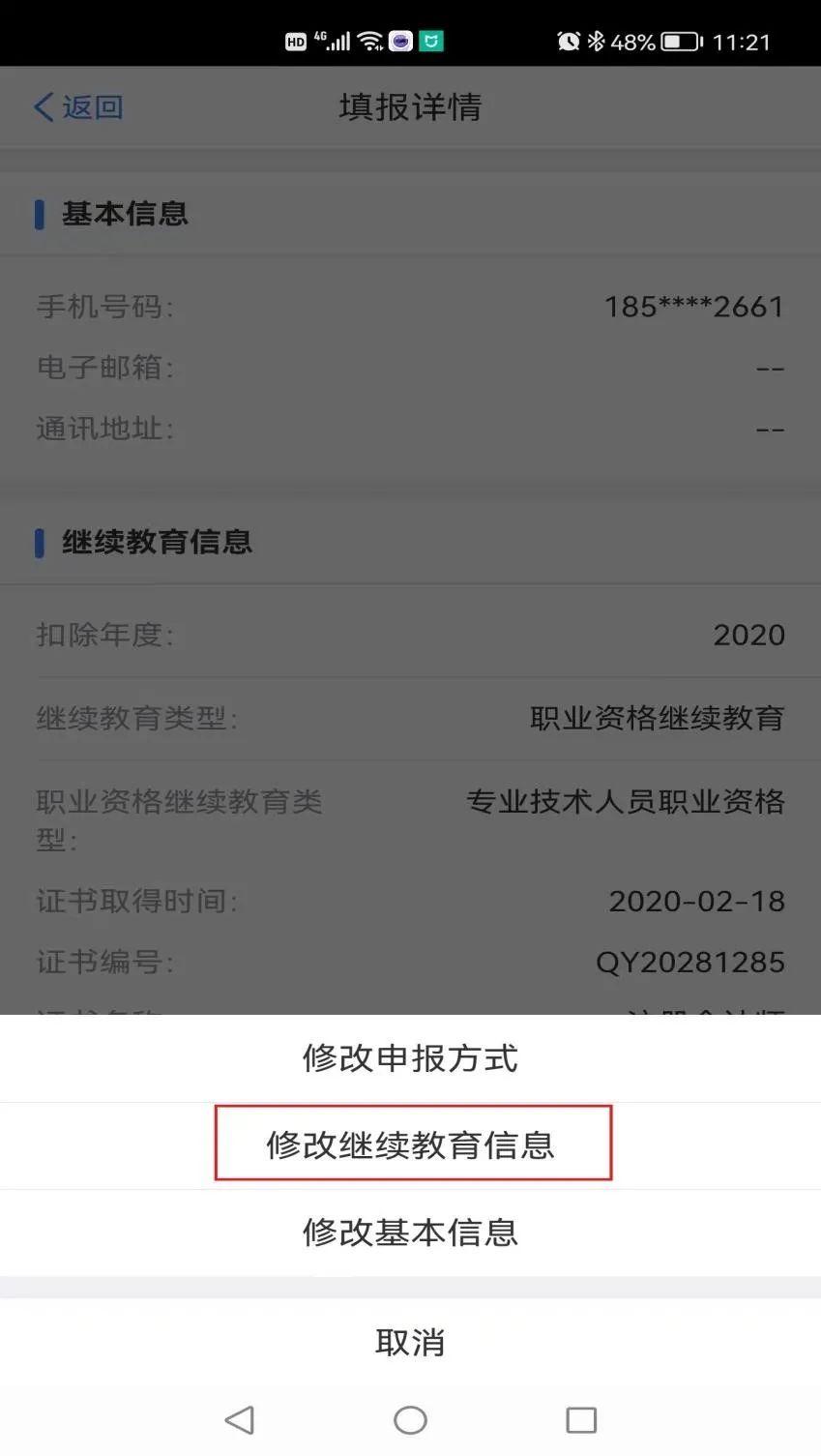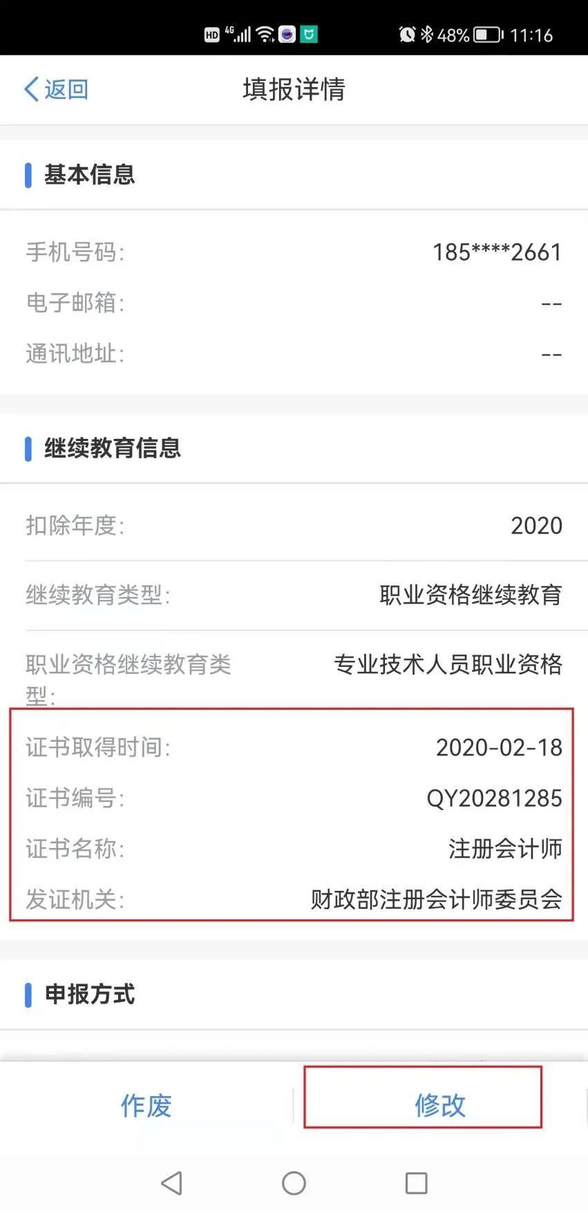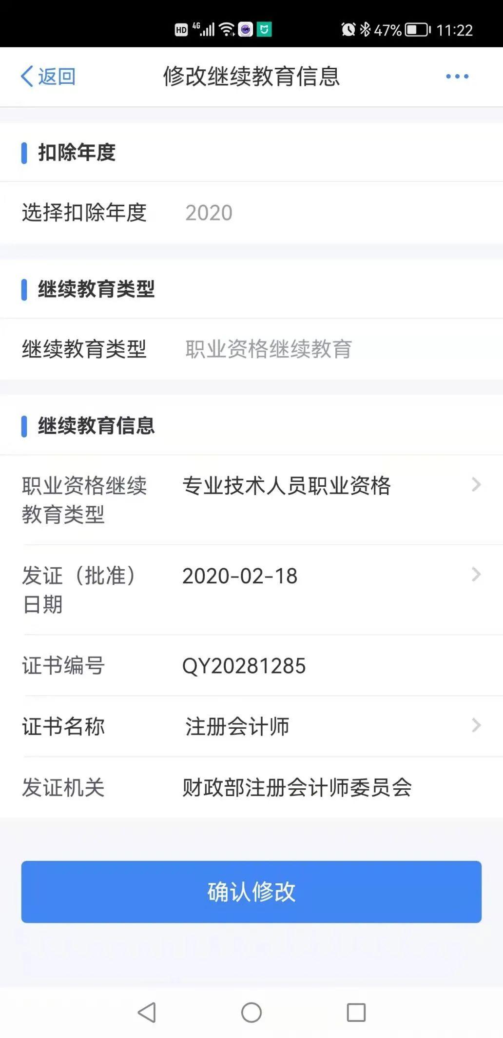 (二)选择对应年度(我们以2020年为例),选择“继续教育—职业资格继续教育”专项附加扣除信息,进入详细界面,核实“证书取得时间”、“证书编号”、“证书名称”及“发证机关”是否存在信息错误。