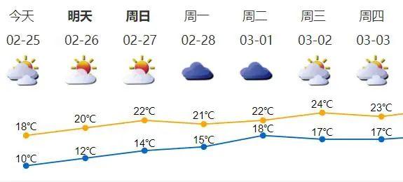 未来三天深圳气温逐步回升。其中25日多云到晴天,白天最高气温18℃;26-27日多云间晴天,气温继续回升,昼夜温差大;2月28日至3月1日云量增多,有零星小雨和轻雾;展望3月2-4日,多云温暖,早晚有轻雾。