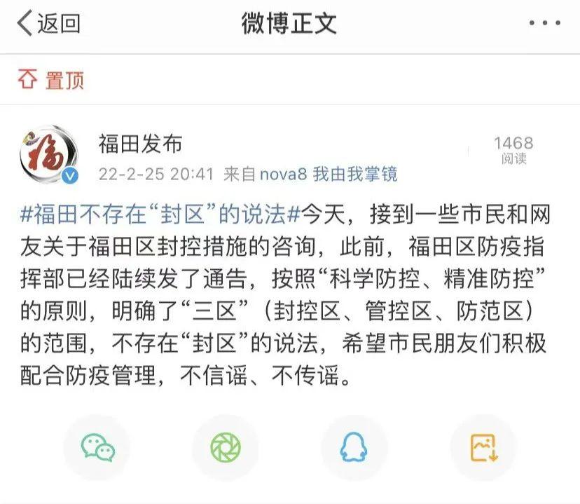 今天,接到一些市民和网友关于福田区封控措施的咨询,此前,福田区防疫指挥部已经陆续发了通告,按照“科学防控、精准防控”的原则,明确了“三区”(封控区、管控区、防范区)的范围,不存在“封区”的说法,希望市民朋友们积极配合防疫管理,不信谣、不传谣。