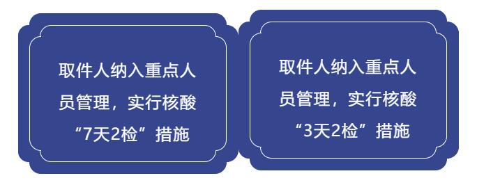 提示:取件人取件时应正确佩戴口罩和一次性手套,减少与快递直接接触,全过程避免用手触摸口、眼、鼻。取件后落实核酸检测同时,加强自我健康监测。