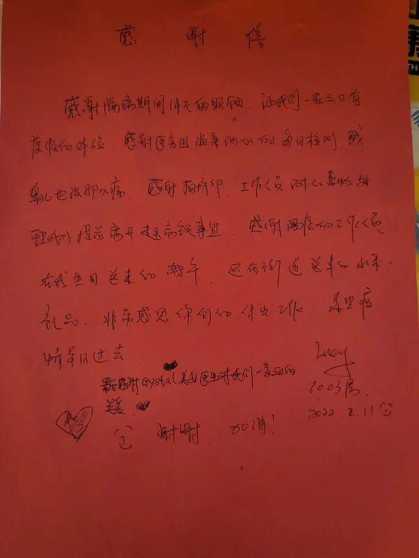 1003房的隔离人员在家人和医护人员的陪伴下,度过了他40岁的生日,“感谢医护人员在隔离期间的照顾,让我们一家三口如在家一般,非常感恩你们的付出,希望疫情早日过去。”隔离人员在感谢信中表达了他对工作人员的感谢。