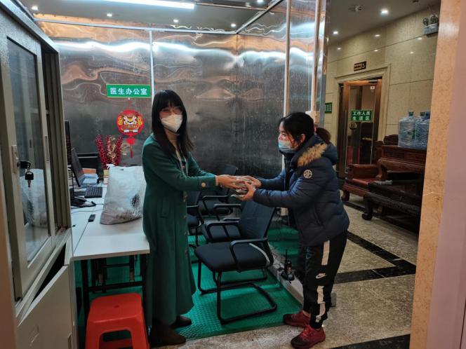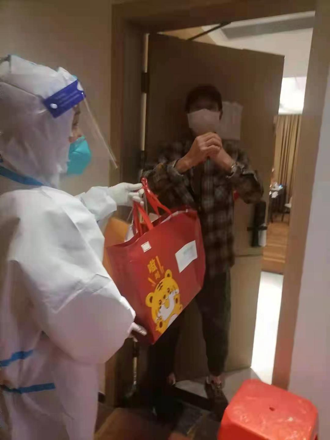 春节期间,隔离酒店工作人员为隔离人员送上慰问品