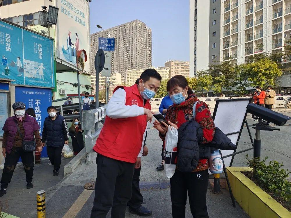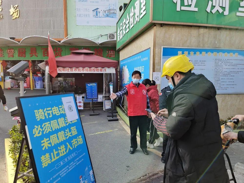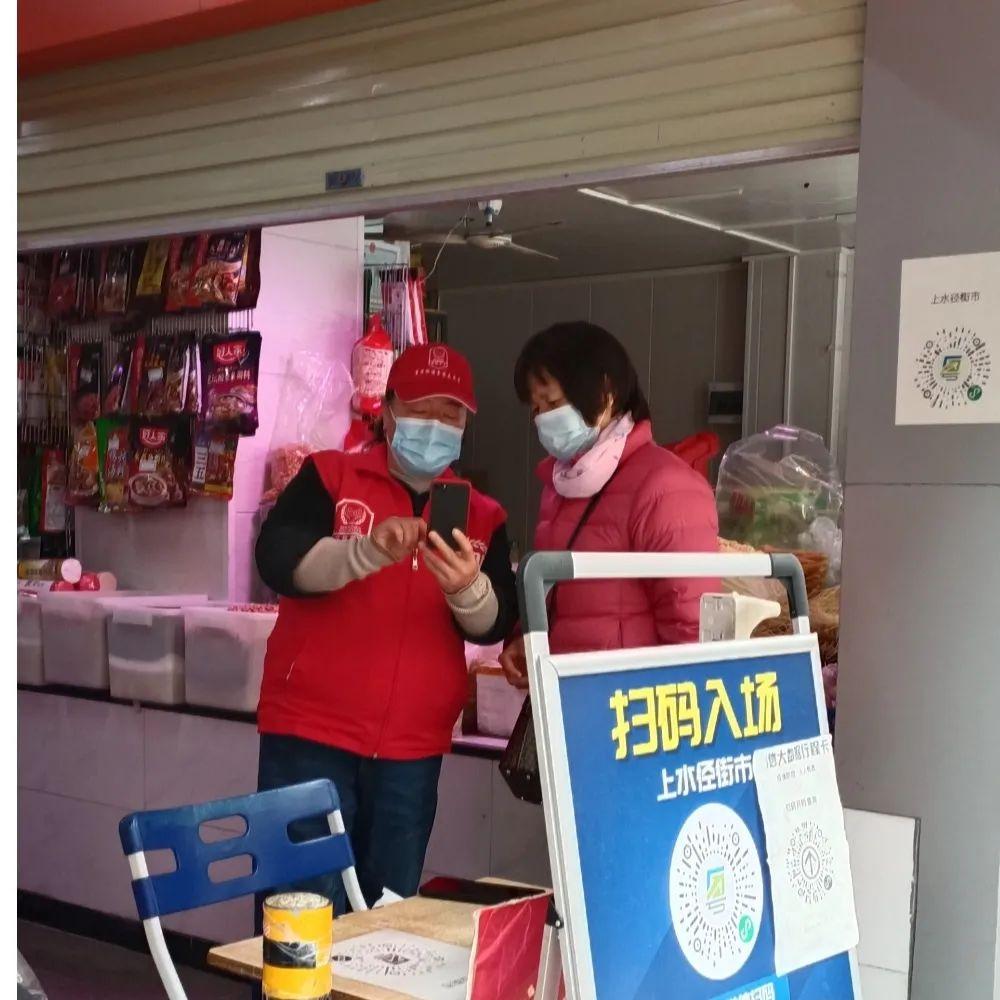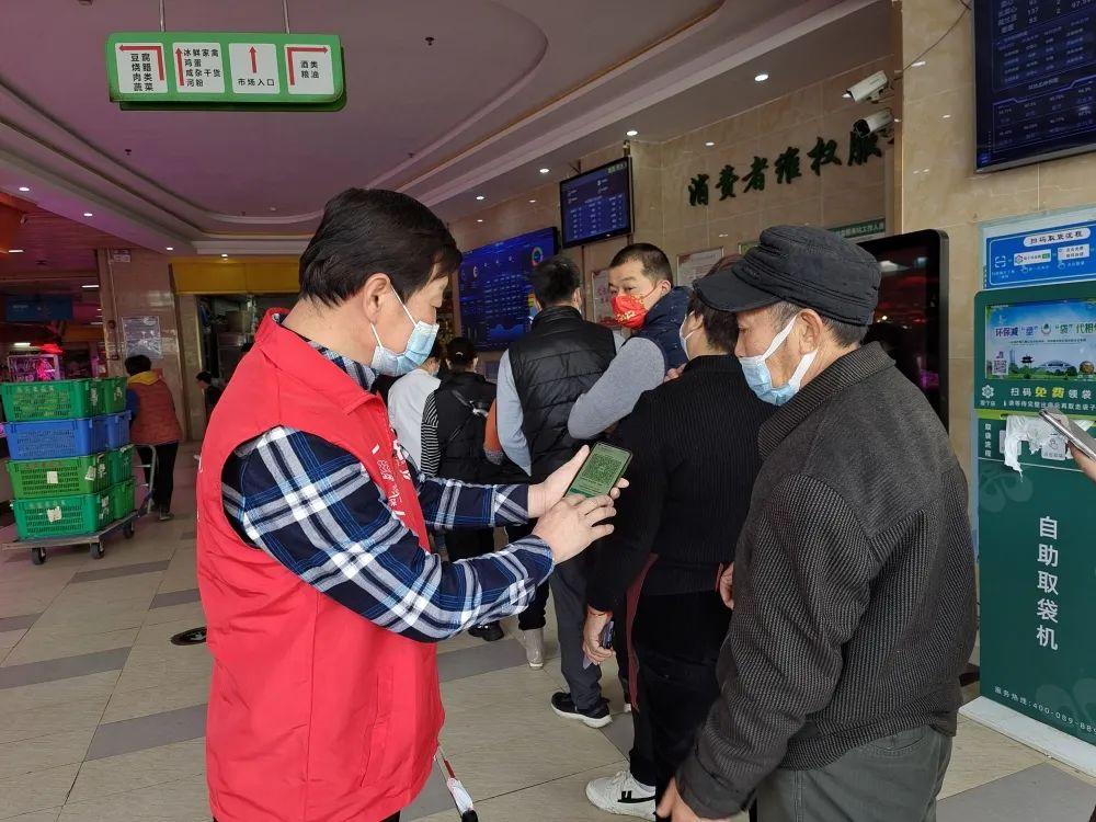 龙岗区食药志愿者对出入农贸市场的市民进行测量体温、督促佩戴口罩、建议用酒精消毒液洗手、查看“粤康码”等志愿服务。对不愿配合的市民进行耐心讲解,做好解释工作,确保防疫无一疏漏。