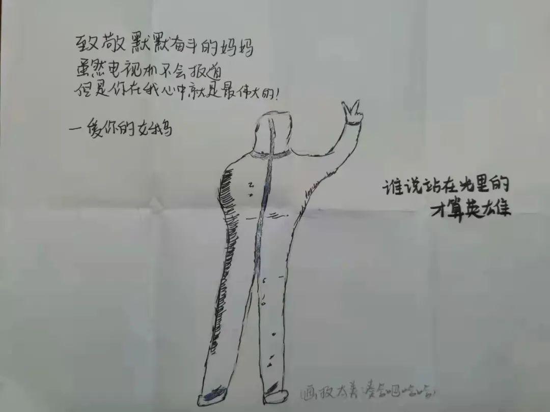 张赟婕拨通了女儿的电话,女儿才袒露心迹:“我给你收拾完衣服,坐在那里看着包裹,就觉得还不够,我一定还要为妈妈做点什么才行。”在上网课的间隙,她拿出笔来画了一幅小画、写下两句话,边写边哭起来。她说,自己在电视上、网络上看到了很多抗疫英雄,她知道现实里还有很多平凡英雄,因为她的妈妈就是其中一个。
