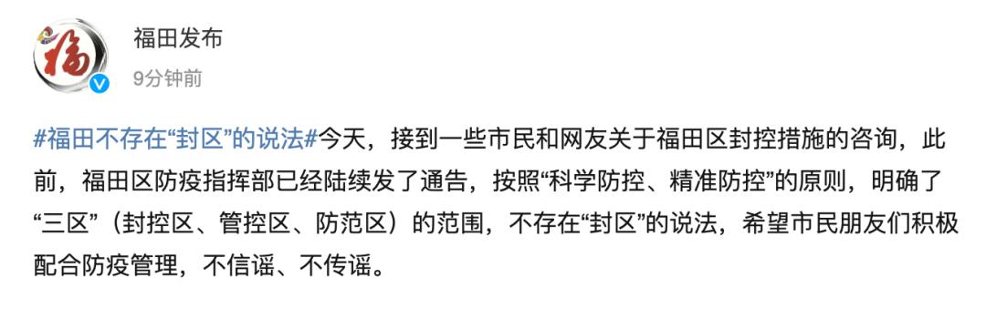 今天,接到一些市民和网友关于福田区封控措施的咨询,此前,福田区防疫指挥部已经陆续发了通告,按照“科学防控、精准防控”的原则,明确了“三区”(封控区、管控区、防范区)的范围,不存在“封区”的说法,希望市民朋友们积极配合防疫管理,不信谣、不传谣。